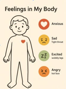 How it works: Show a simple outline of a body (you can draw it or use a printable). Use magnets, stickers, or crayons to mark where children “feel” something in their body when they have certain emotions.