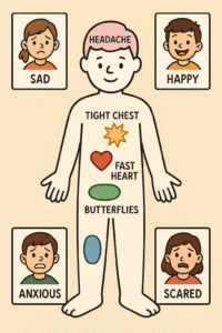 Goal: Help children identify and name emotions, and connect them to how their body feels.