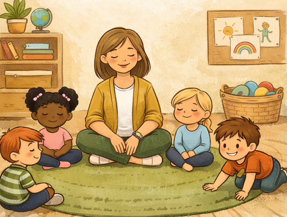 We sit together for a mindful moment. Back straight. Legs crossed. Eyes closed — if we choose. We breathe slowly. We practice stillness.